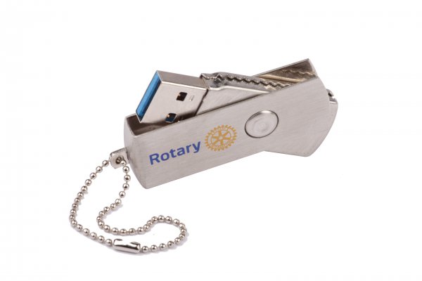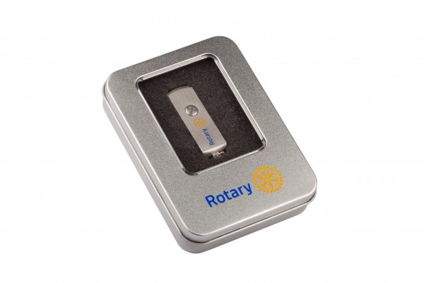 Dieser 64 GB USB Stick ist geschützt in einem dekorativen Aluminium Einschub mit einem gedruckten Rotary Rad.