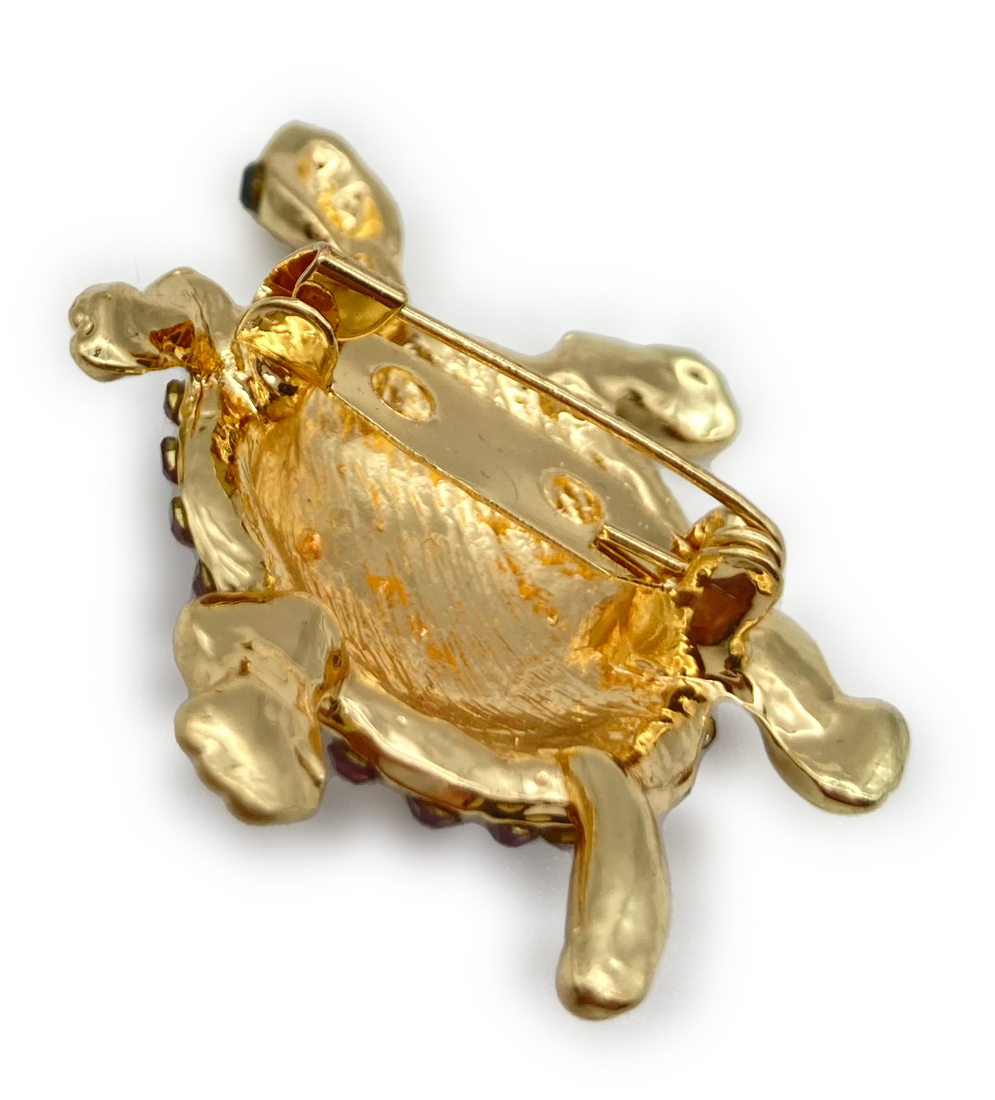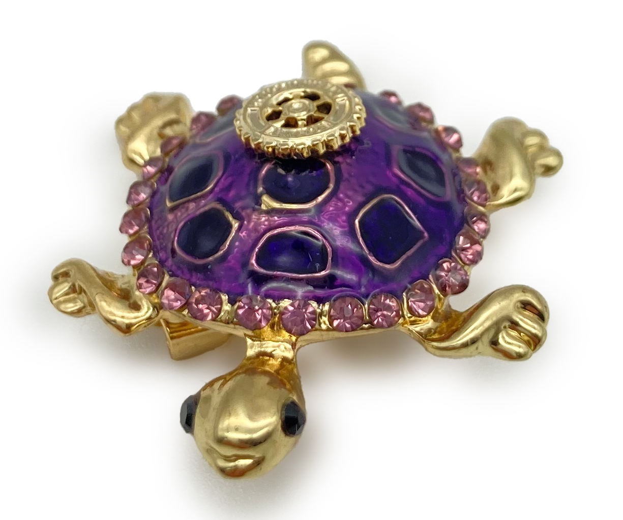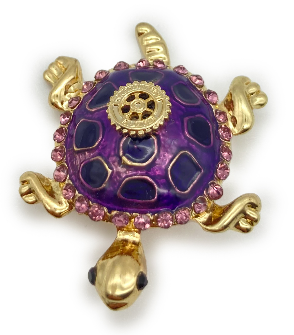 Elegante Brosche für die rotarische Dame mit aufgesetztem Rotary Rad am Rücken der Schildkröte. Die Befestigung erfolgt durch die Nadel auf der Rückseite der Brosche.