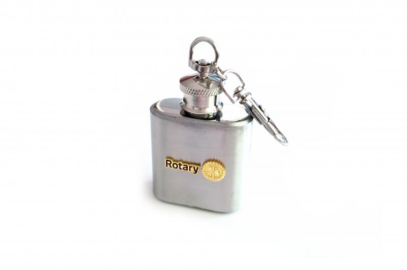 Kleiner Flachmann mit Karabinerhaken zum Mitnehmen. Das Rotary Logo ist aufgesetzt und wirkt daher sehr schön.