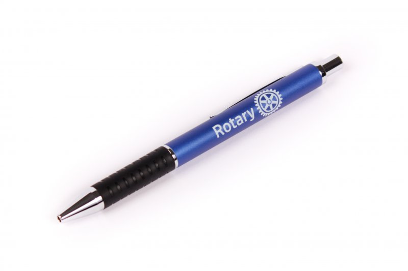 Metall Kugelschreiber mit aufgedrucktem Rotary Logo. Der Kugelschreiber hat eine blaue Miene.