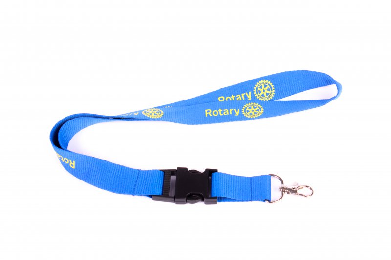 Schlüsselband 25mm breit mit Metall Karabinerhaken und Kunststoff-Steckverschluss. Auf dem Schlüsselband ist 6x das neue Rotary Logo (Masterbrand) gedruckt.