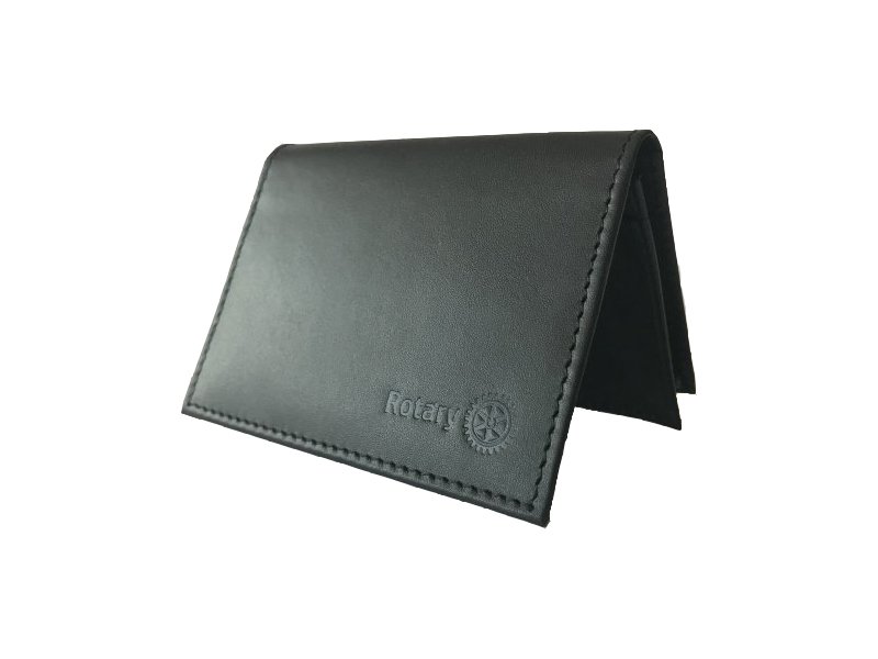 Elegantes Visitenkartenetui aus schwarzem Leder mit geprägtem Rotary Logo. Das Etui ist geeignet für Scheckkarten und Geldscheine. Es lässt sich spielerisch in die Jacketinnentasche oder die Hosentasche stecken.