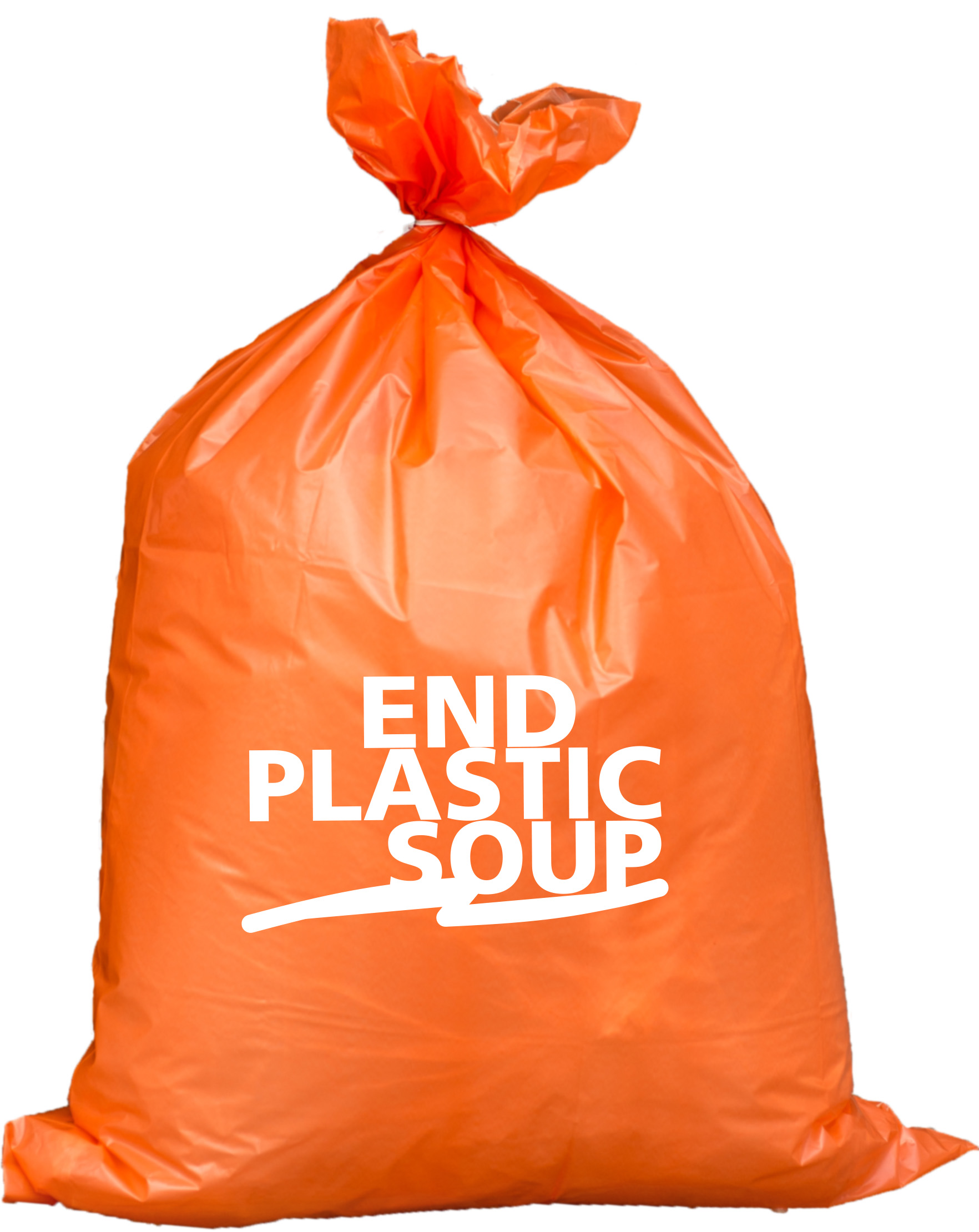 Müllsäcke bedruckt mit dem End Plastic Soup Logo in strahlendem weiß auf dem orangen Müllsack. Der Sack hat ein Fassungsvermögen von 120 Litern und ist mit einem Zugband einfach zu verschließen. Die Müllsäcke lassen sich eindrucksvoll aufeinanderstapeln um ein Pressefoto nach erfolgreicher Sammelaktion zu machen. Es befinden sich 10 Stück auf einer Rolle. Die Müllsäcke werden mit recyceltem Altplastik hergestellt.