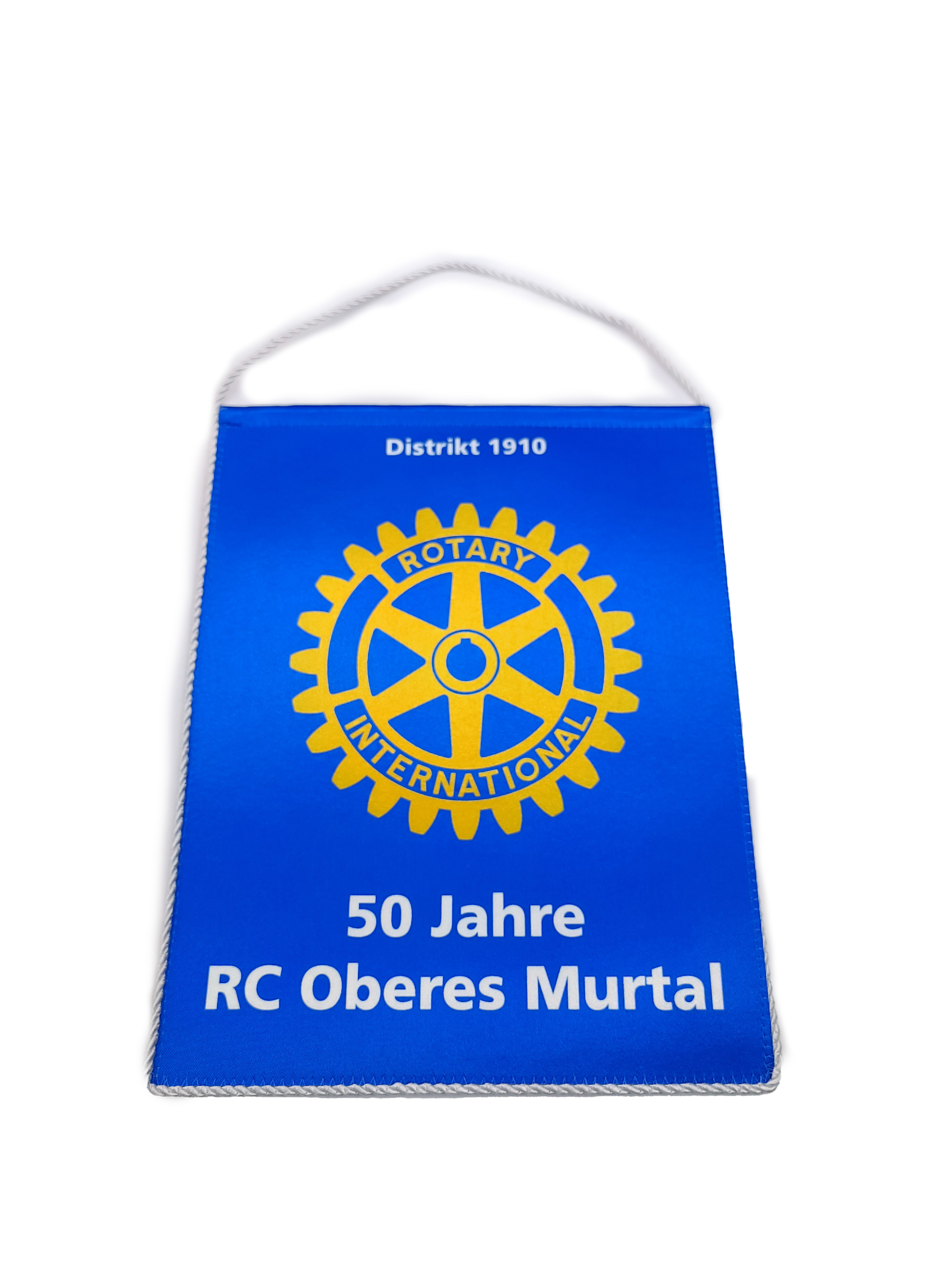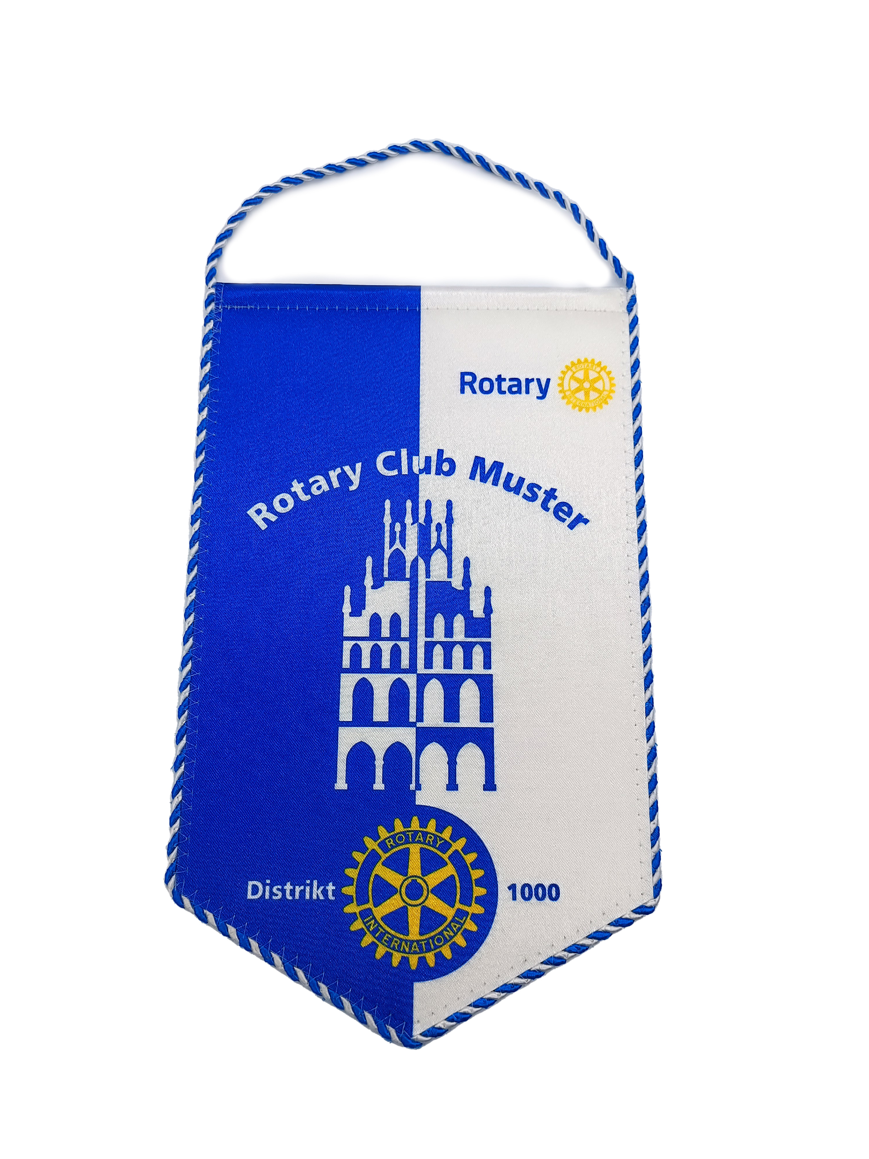 Standard size for the pennants is 15x25 cm. You can choose between pointed or rounded lower edge. The color of the cord can be customized according to your layout. We offer you full service starting with the graphic design, preprint up to the final product..