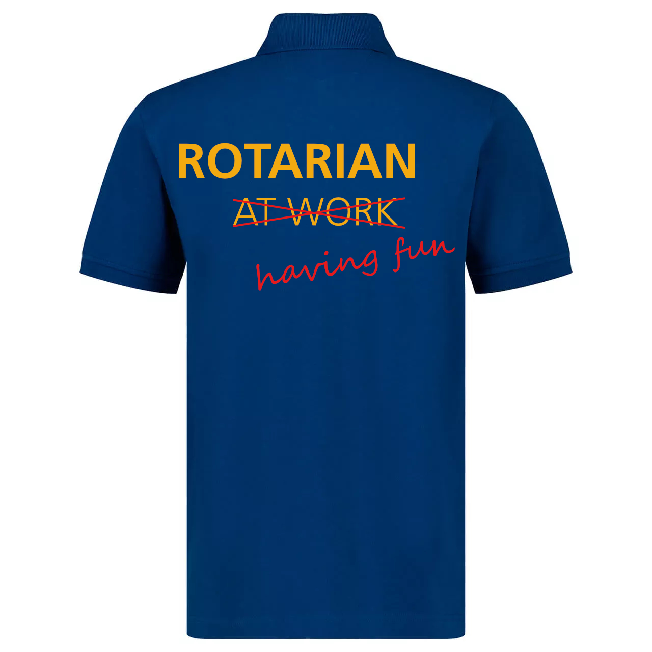 Blue Rotary polo shirt with "Rotarian at work" backprint. Perfect for Rotary campaigns to ensure a uniform appearance.