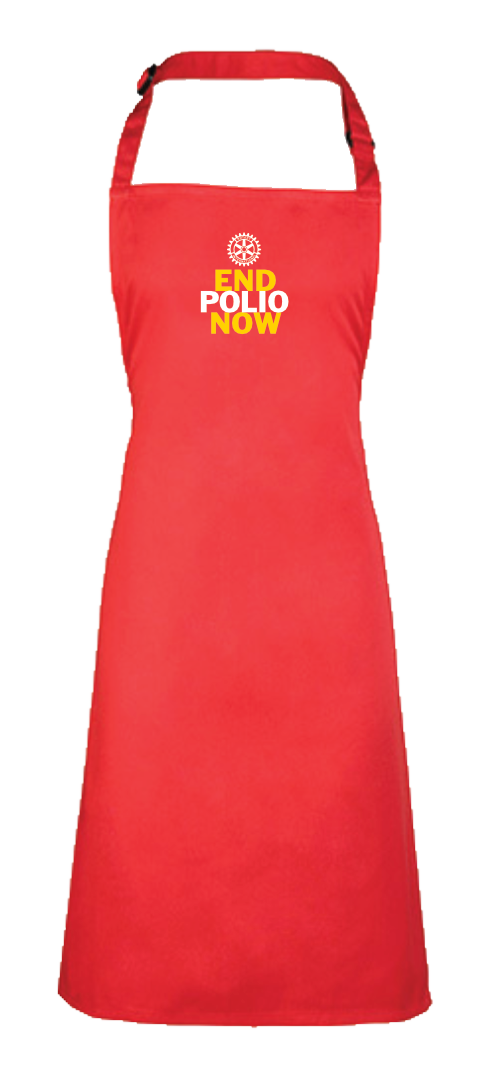 Red End Polio Now Apron with textile printing of the EPN logo for Rotarians or service employees during club activities that include food (Sales of mulled wine or waffles, wine tastings, etc.). The apron is red and has the EPN logo printed. Combined with a white shirt it gives a very elegant appearance.
