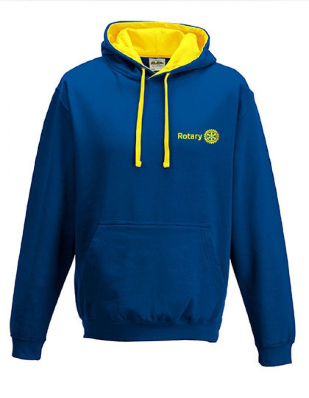 Hoodie in the Rotarian colours blue and gold. Fluffy warm, trendy outfit. Material: 80% cotton / 20% polyester