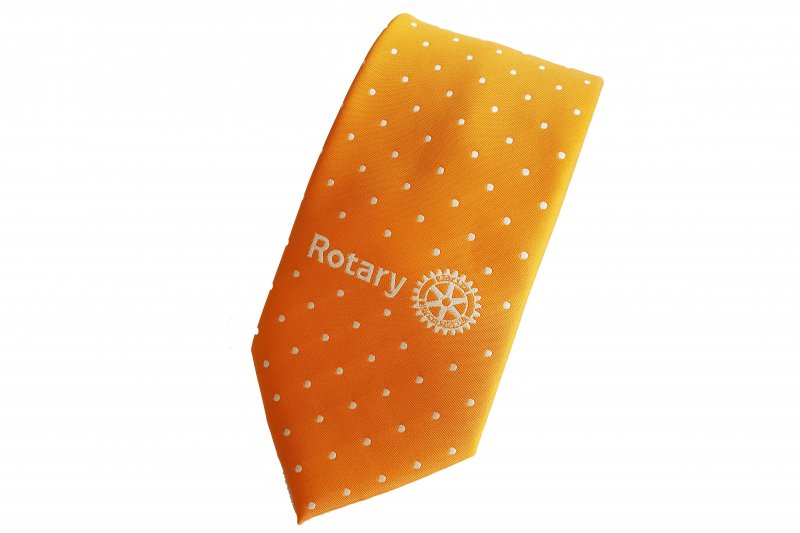 This tie in a strong Orange color and dot pattern is refined through an embroidered Rotary Masterbrand. With a buttoned Blazer the emblem is not visible, which makes wearing this tie on non-rotary occasions possible. However, the Logo can be well visible if desired.