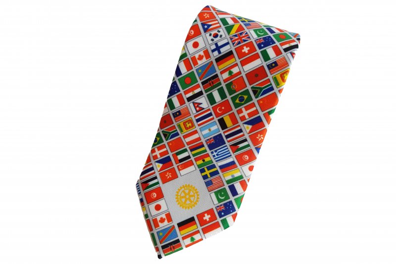 This tie stands out with its destinctive flashy design, made of international Country Flags. It is refined through a embroidered Rotary Emblem in the center postion. With a buttoned Blazer the emblem is not visible, which makes wearing this tie on non-rotary occasions possible. However, the Logo can be well visible if desired.