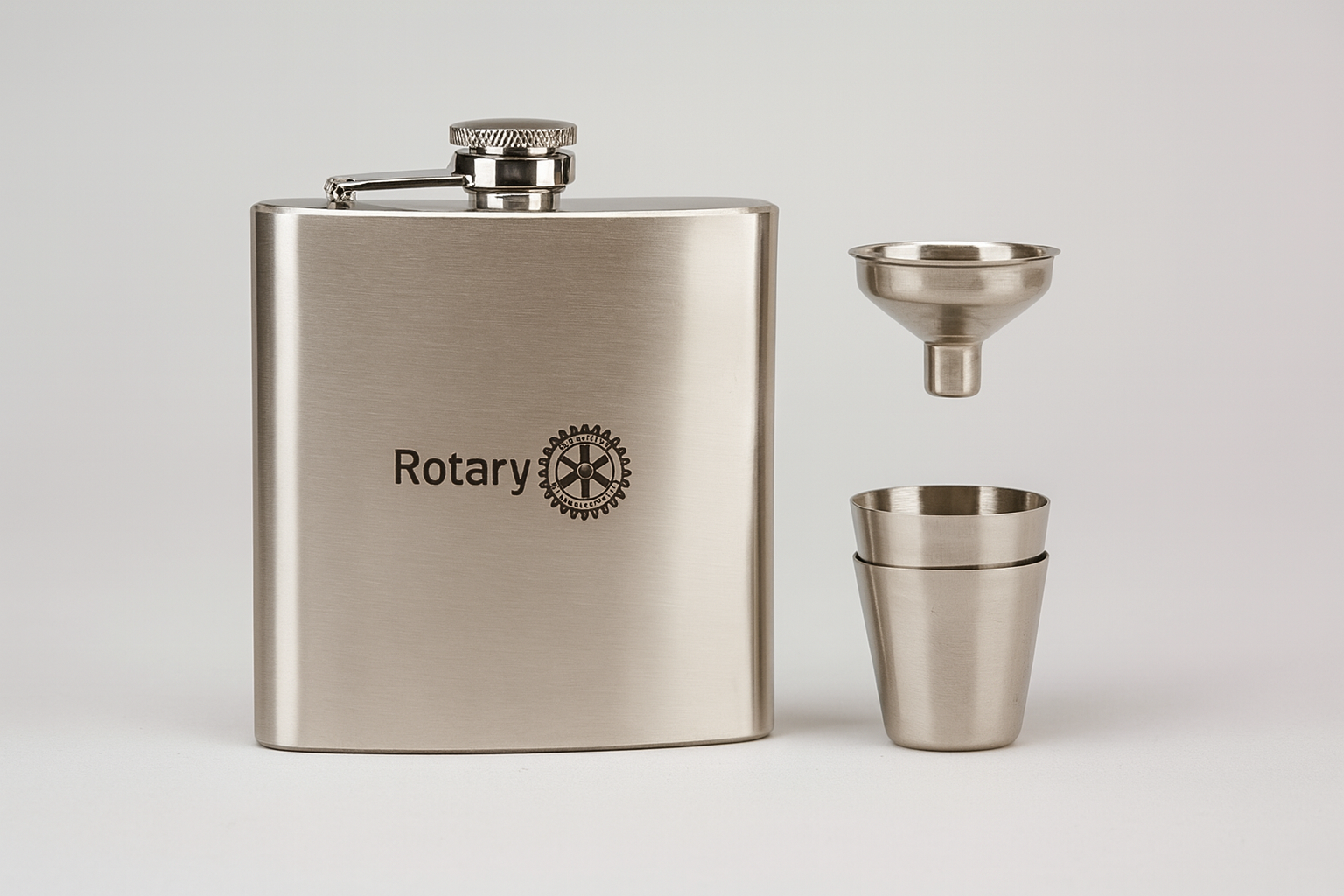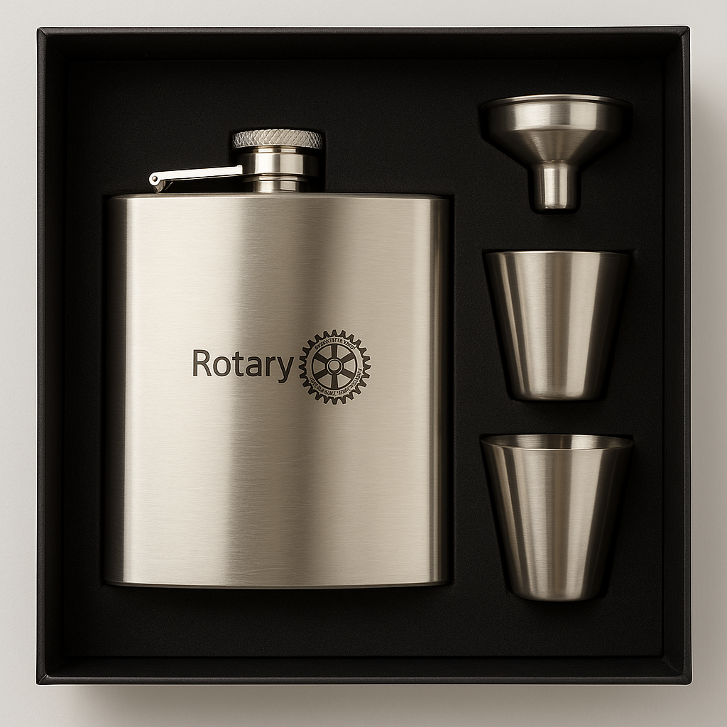 This handy and robust pocket bottle made of stainless, brushed steel is perfect for Rotarian trips, as well as for rounds at home. Along with a filler plug and two shot glasses, this bottle has one clear purpose: to deepen the Rotarian friendship.
