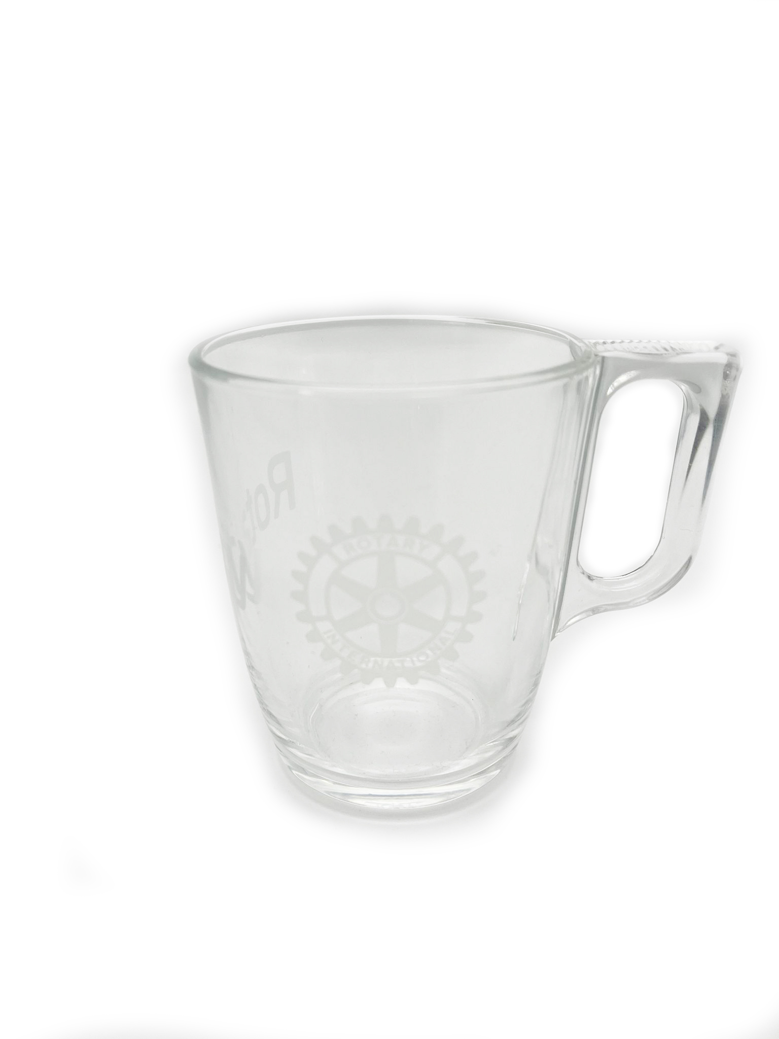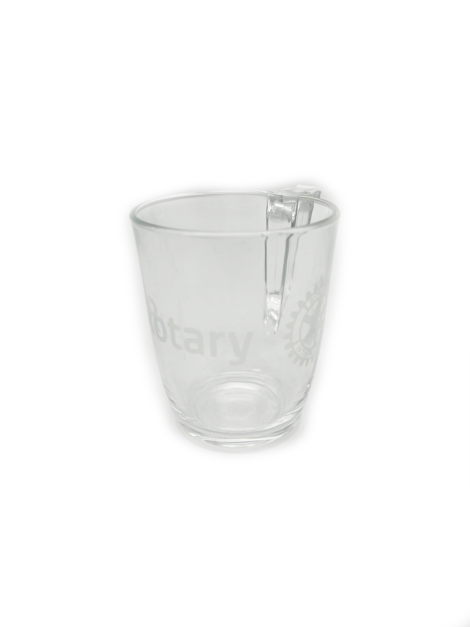 Transparent cup with the sandblasted Rotary log in the middle. Ideal for a cup of tea!