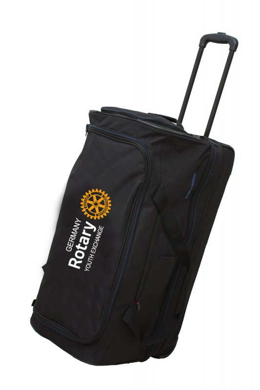 Rotary Youth Service travel bag in black. Comfort roles Super light Practical bottom compartment Large main compartment Comfortable pleat Various outside pockets Ideal for travel, sports and hobbies Brand: Travelite Material: polyester Dimensions: 70 x 38 x 37 cm Weight: 2.3kg Volume: 98 l Extended volume: 119 lThe bag has an approx. 25 cm large stick of the youth service logo on the lid.The delivery time for goods in stock is 2-4 working days. If we have to produce the bags first, the delivery time would be approx. 3 weeks.When ordering for a group, the bags can also be numbered for easy identification.