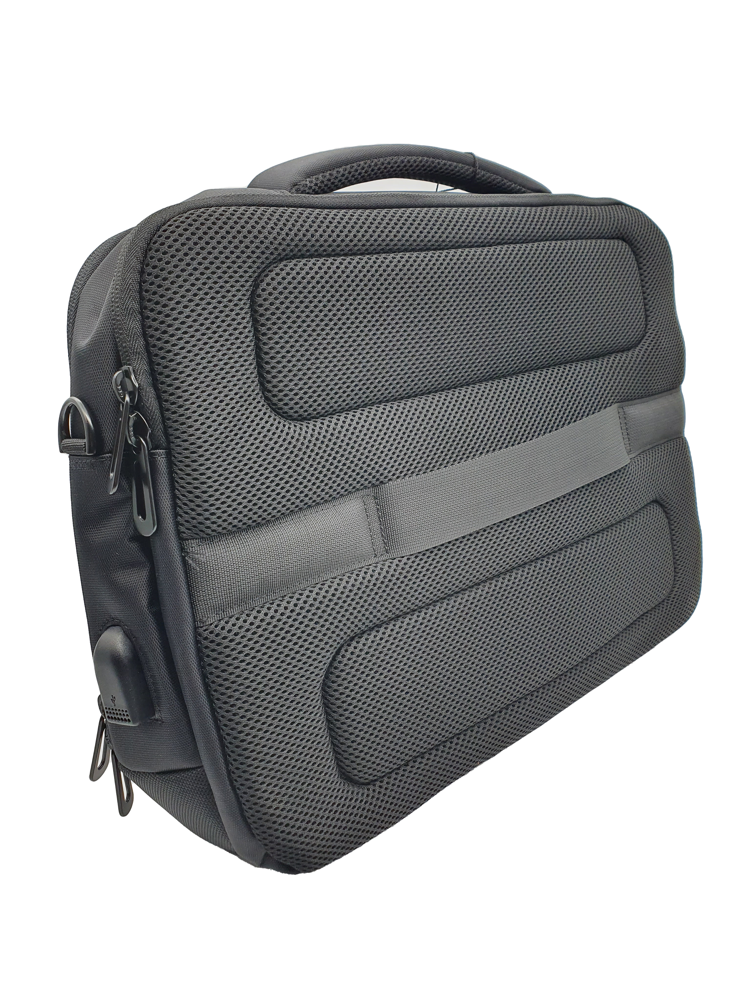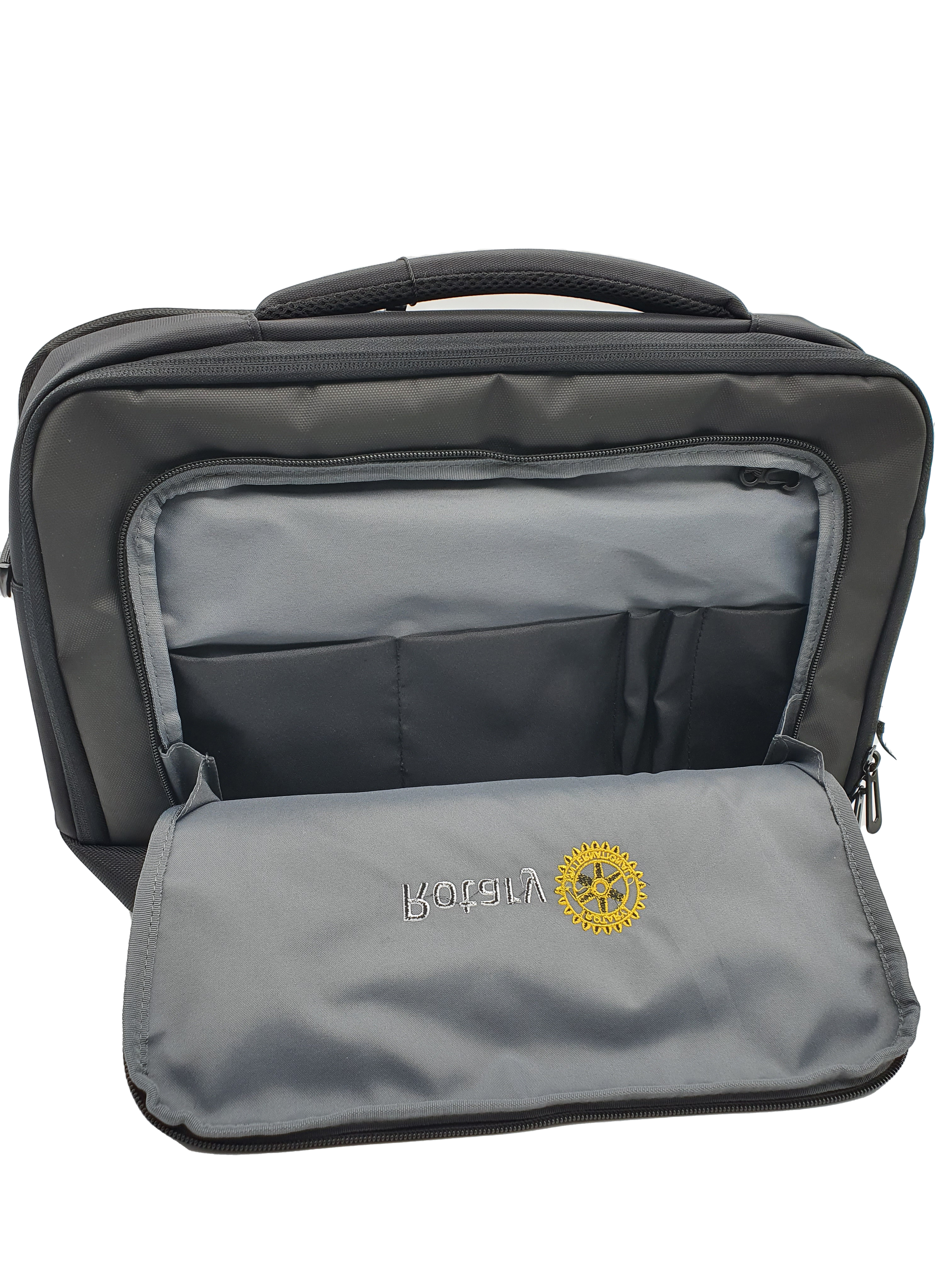 Padded laptop compartment with external access. Padded tablet compartment inside. Front pockets with practical compartments. The case has an integrated USB charging port that allows for easy charging of mobile devices. Inner zip pocket for valuables. key hook. Detachable, adjustable shoulder strap. Embroidered Rotary emblem.